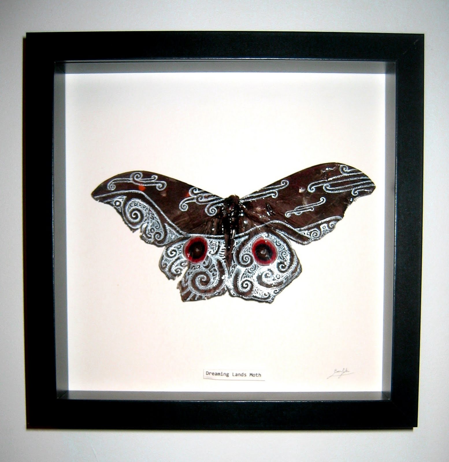 This collection revels in the human compulsion to analyze and re-analyze the string of memories and emotions which compounded form the essence of life. By pinning down these memories and framing them under glass I have endeavored to regain a little of the control which time and experience cloud in the human mind and preserve forever that pivotal moment of thought which seems so precious and important before it has outlived its moment of clarity and fades away.Below are some examples of butterflies and moths which have been given a whole new purpose; to be carriers of memories and desires set behind glass to be admired and collected. I hope they intrigue and capture the imagination, they are precious things and live outside of time.